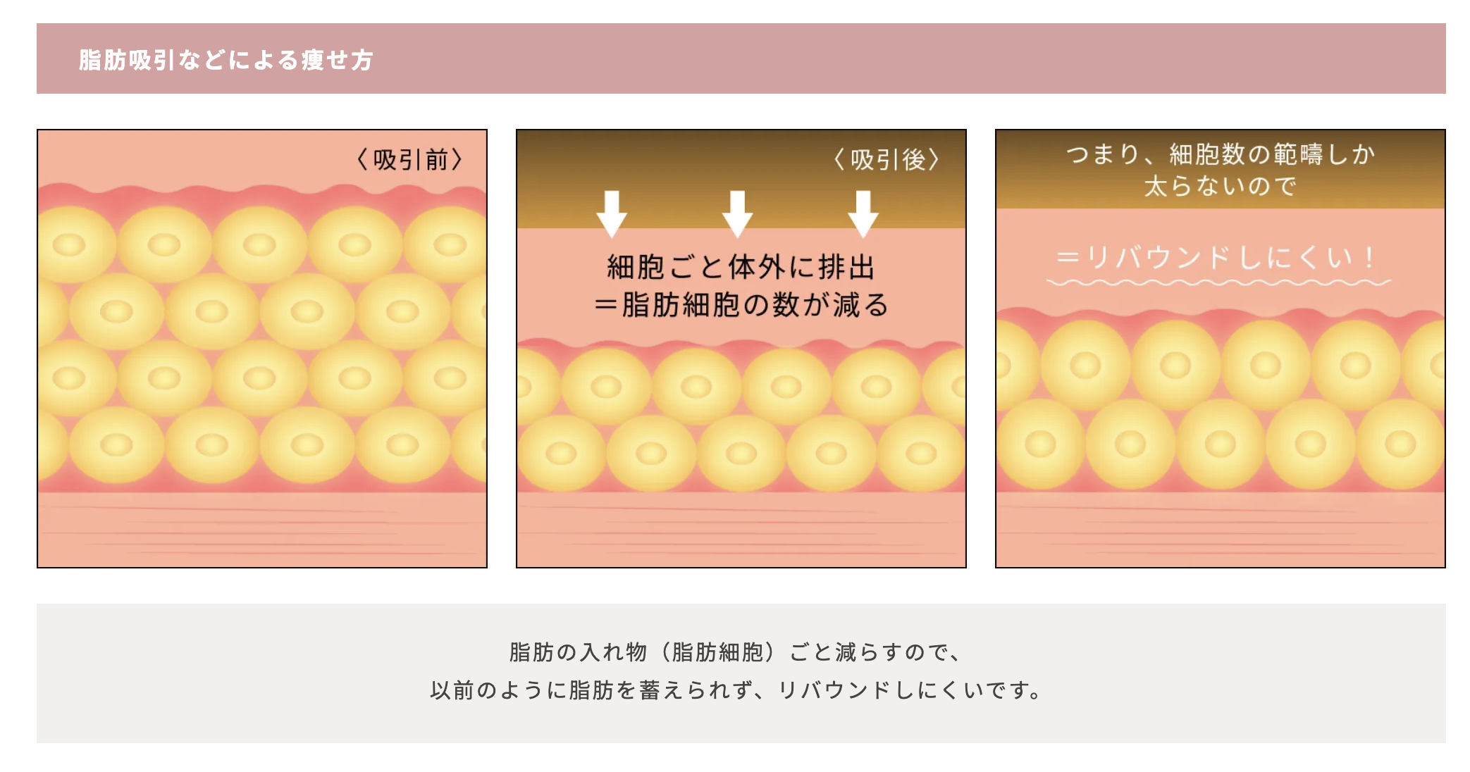 脂肪吸引は脂肪を溜め込む脂肪細胞自体を減らすことができるため、脂肪が貯まる原因事態を取り除くことが可能です。