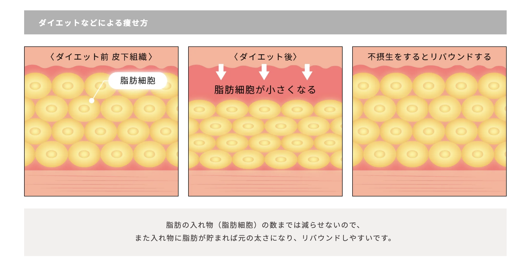 運動や食事制限などのダイエットの場合、体内に蓄積された脂肪細胞が小さくなることで体積が減り身体が痩せます。