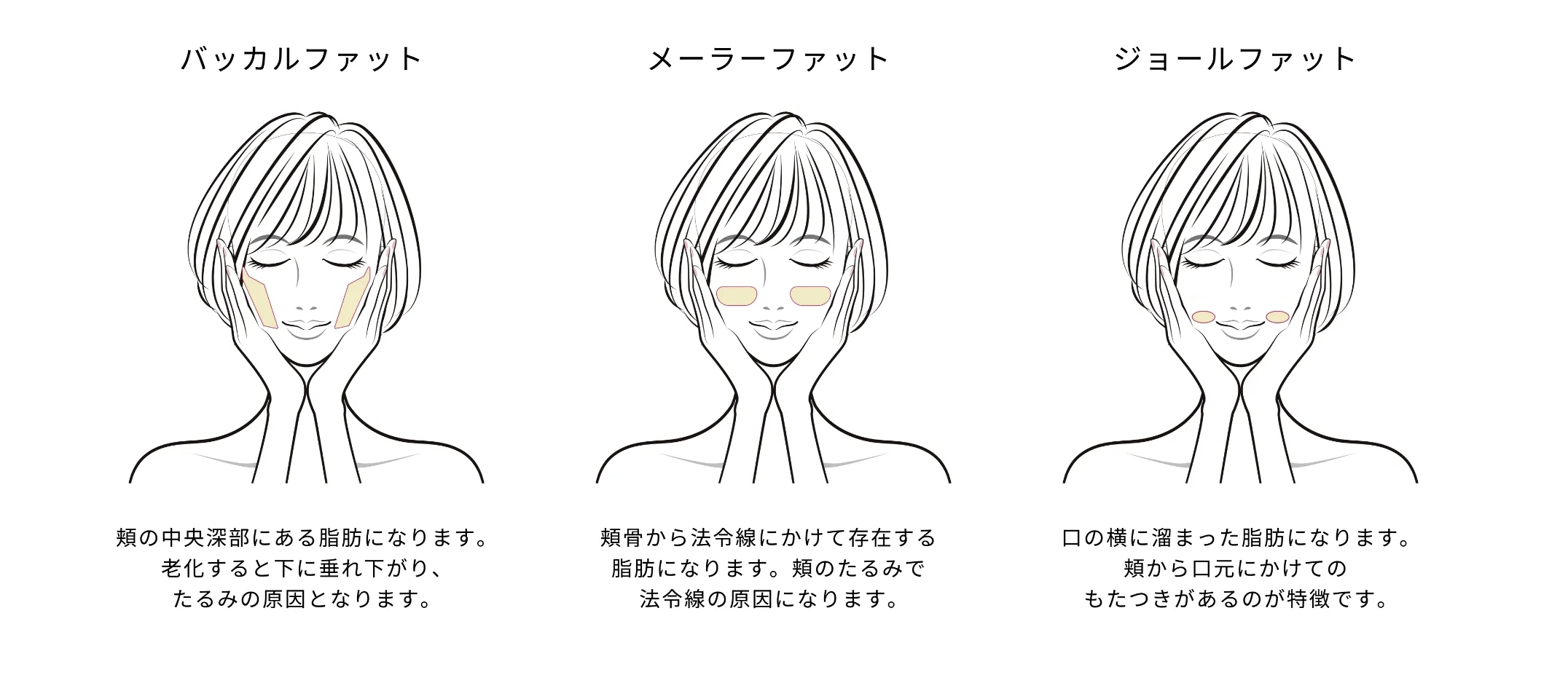 頬骨の上側にある脂肪のことです。本来は法令線と目の下のあたりの間を埋めています。メーラファットが下垂してくると法令線に乗っかるようにして下がってしまうため、法令線が深く見えたり笑った際に頬が盛り上がって見えてしまう原因となります。